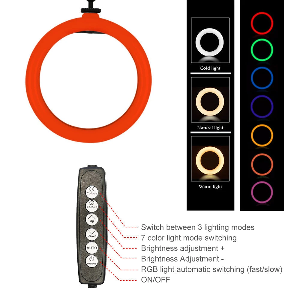 Anneau lumineux RVB à intensité variable : l’anneau lumineux RVB dispose de 3 modes d’éclairage conventionnels (lumière chaude, lumière naturelle, lumière froide) et de 7 options d’éclairage RVB au choix. Chaque mode a 10 niveaux de luminosité, vous avez donc de nombreuses options créatives avec lesquelles jouer. L’équipement que les influenceurs se doivent d’avoir. Le Ring Light est robuste et lumineux ,sans points noirs ni ombres, et peut répondre à vos besoins dans différentes circonstances.