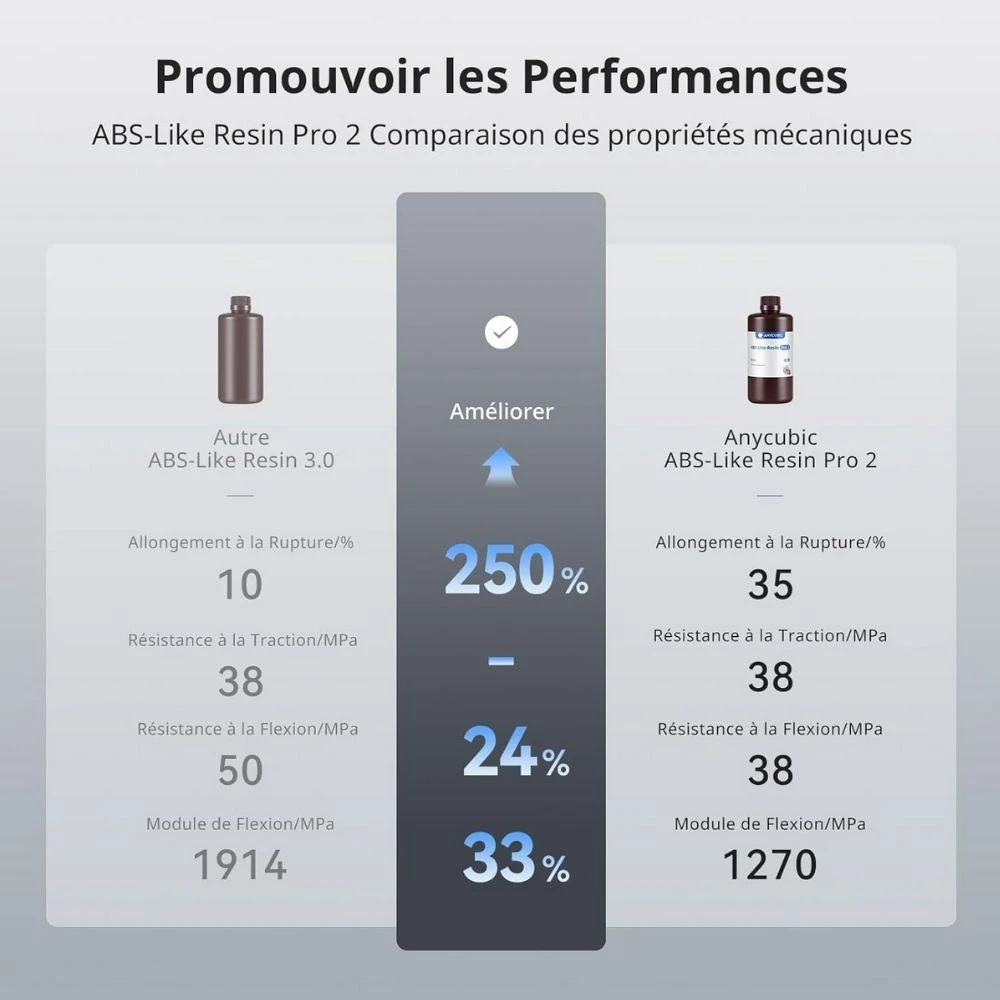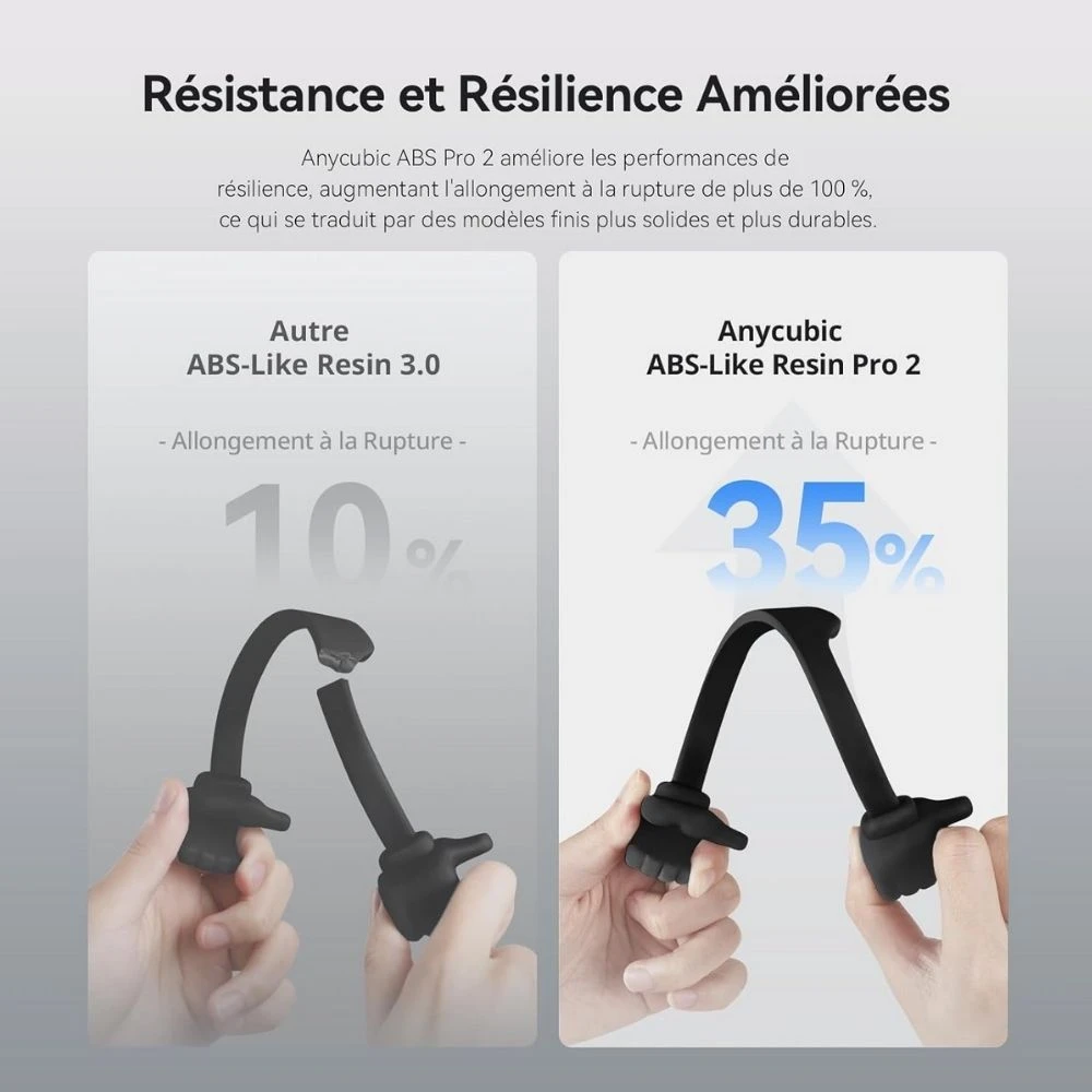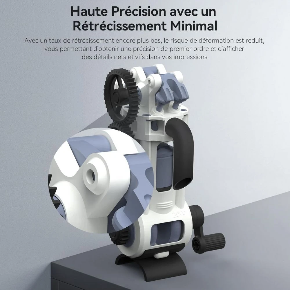 Cette résine s’appuie sur les excellentes performances de résistance à la traction et à la flexion de la version précédente. Elle pousse encore plus loin la robustesse, en doublant l’allongement à la rupture. Ainsi, les modèles imprimés sont plus solides et plus durables, parfaits pour créer des pièces structurelles, des prototypes industriels et des fixations qui demandent à la fois une grande résistance et une haute ténacité.