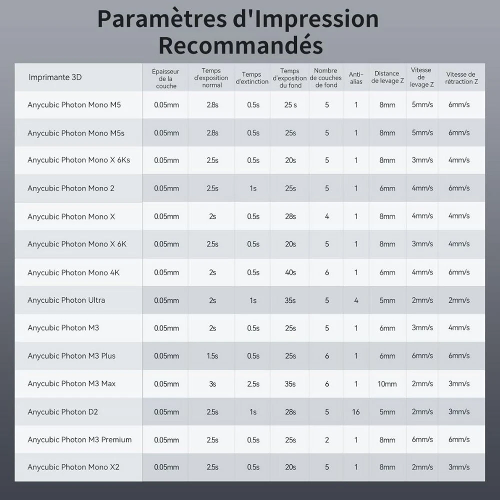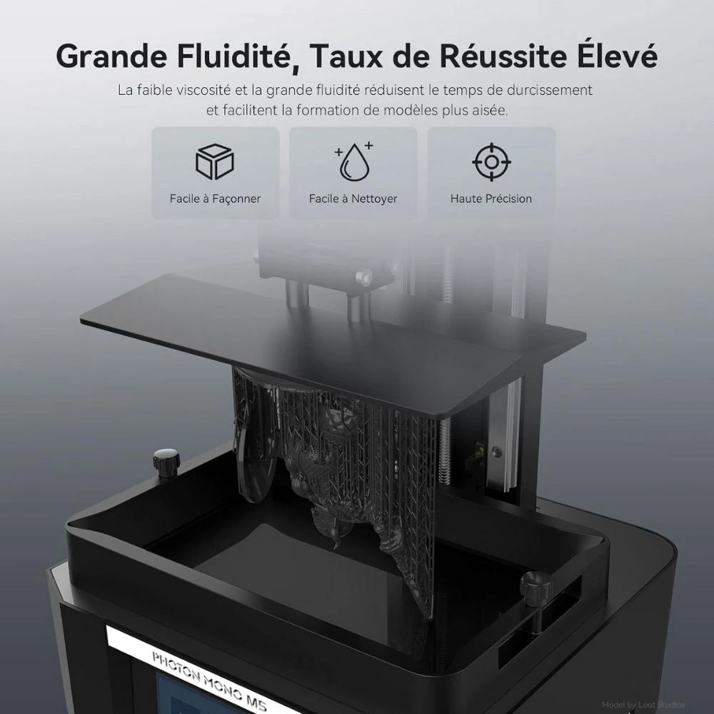 Cette résine, avec sa faible viscosité et sa grande fluidité, accélère le temps de durcissement et simplifie la mise en forme des modèles. Elle permet également une refusion rapide, ce qui limite la délamination pendant l’impression. De plus, l’adhérence au fond du plateau est améliorée, réduisant ainsi le risque d’échec lors de l’impression.