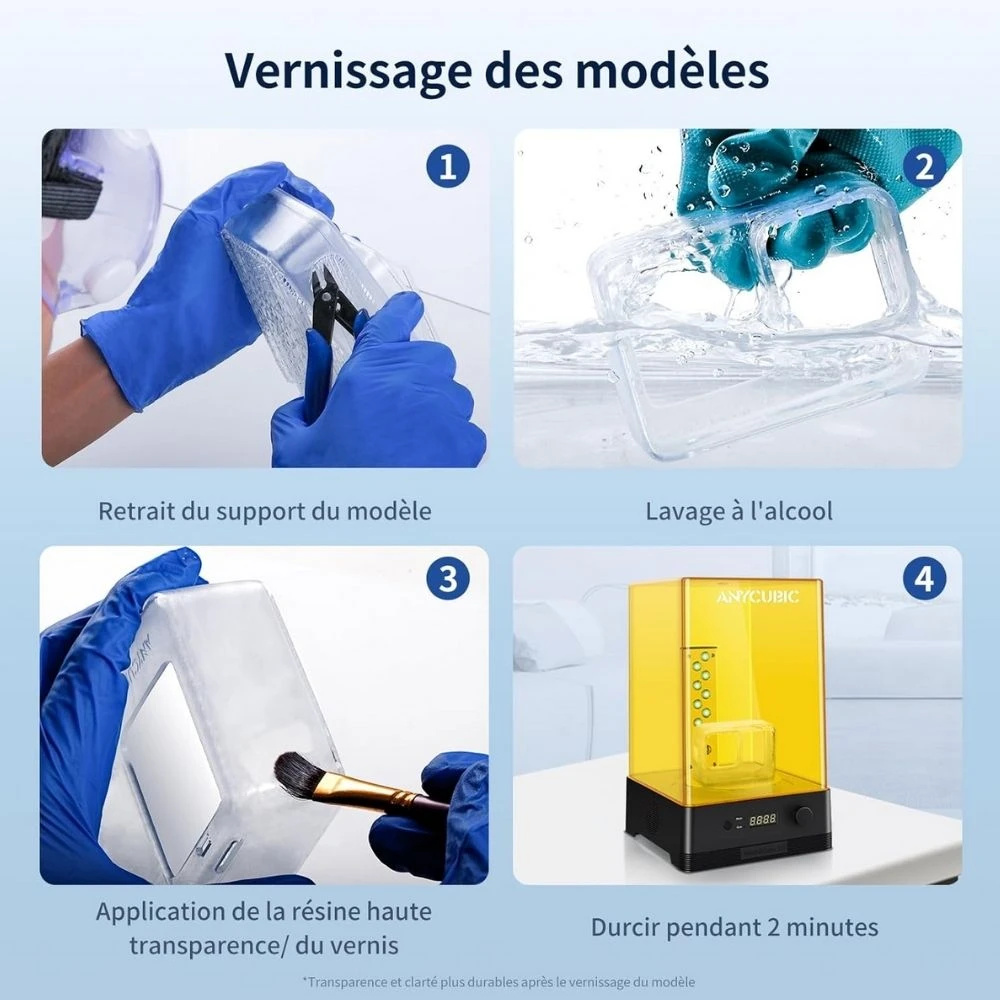 - Afin de garantir la performance de la résine, veuillez retirer le modèle à temps après le nettoyage pour éviter qu’il ne trempe dans l’eau pendant une longue période.