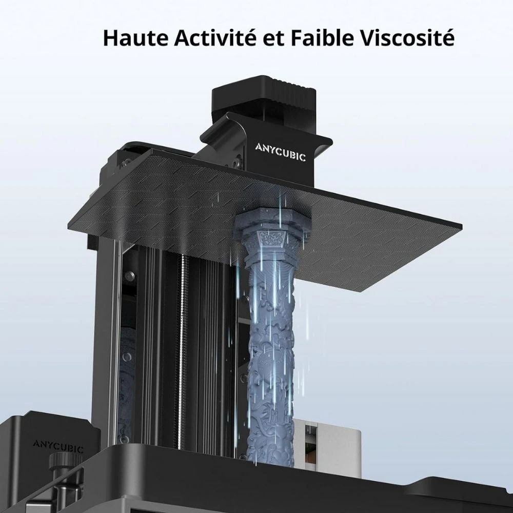 Cette résine est deux fois moins visqueuse que la résine classique. Grâce à sa faible viscosité, elle permet de dissiper rapidement la chaleur lorsque la plateforme bouge, évitant ainsi la surchauffe et favorisant une refusion rapide. Lors de son utilisation avec l’imprimante Anycubic Photon Mono M7 Pro, elle permet d’imprimer une couche de 0,1 mm en seulement 2,11 secondes, ce qui est 21,56 % plus rapide qu’avec une résine standard. Au maximum, elle permet d’imprimer à une vitesse de 170 mm/h avec une hauteur de couche de 0,1 mm, soit 30,77 % plus rapide que les résines habituelles.