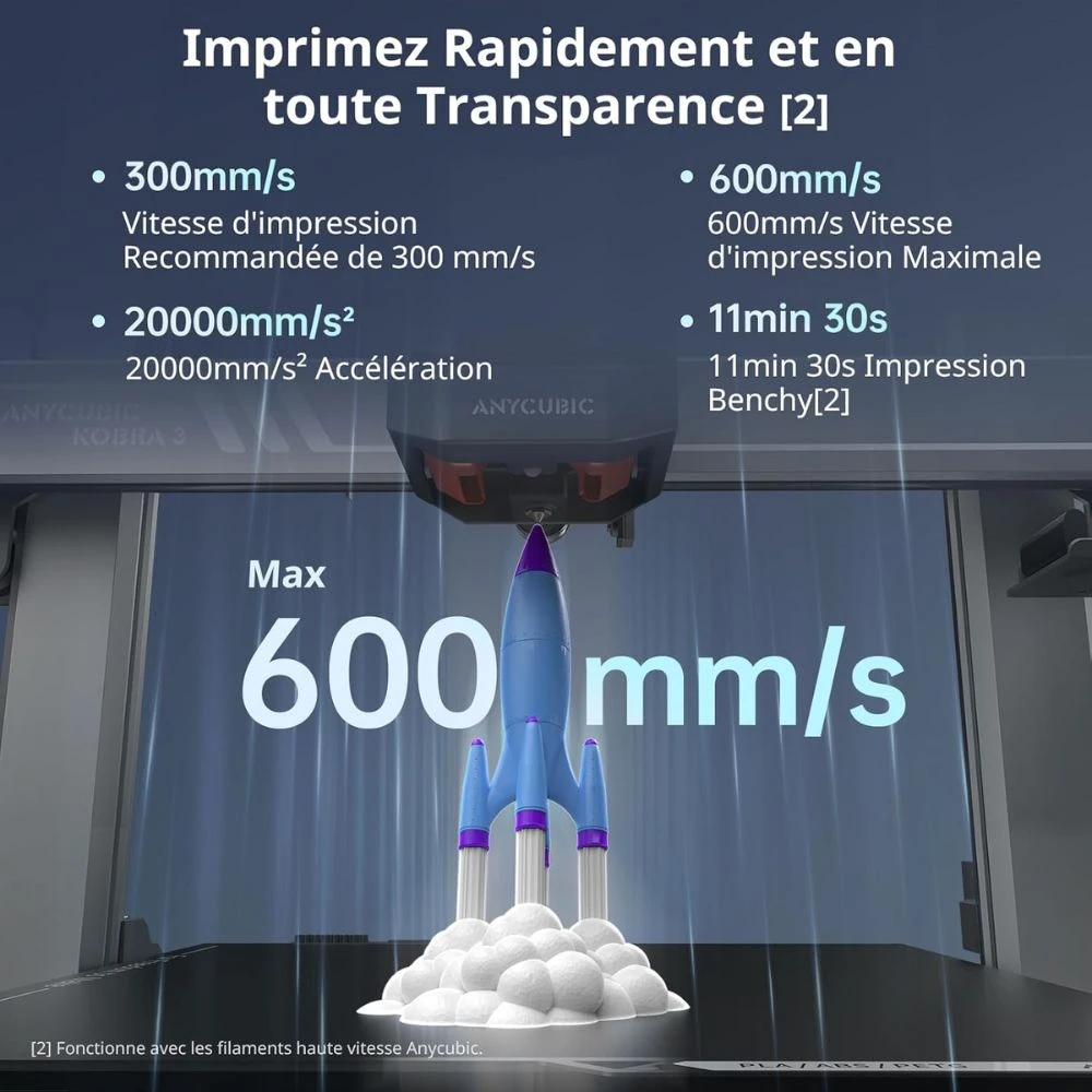 Les performances de la Kobra 3 permettent une impression ultra rapide à 600 mm/s maximum avec une accélération de 20000 mm/s2.