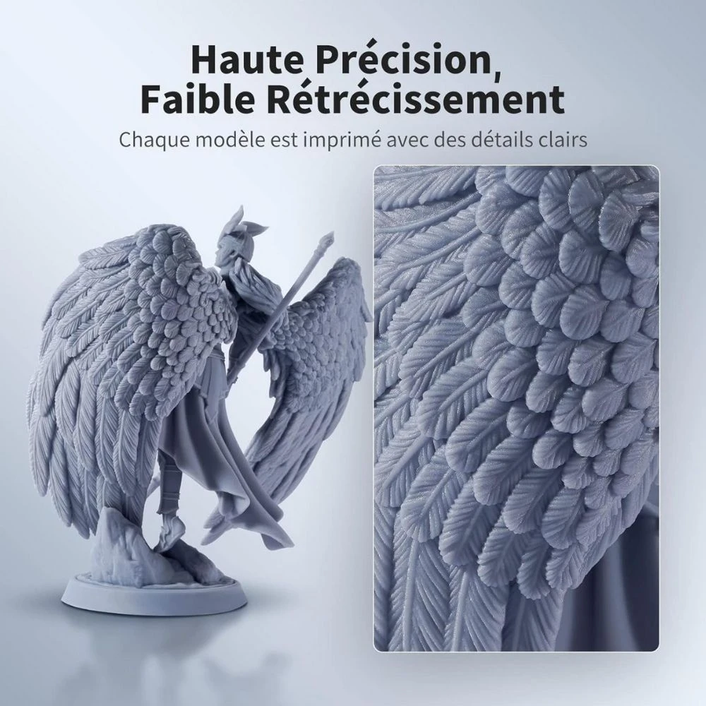 Grâce à son faible taux de rétrécissement, cette résine vous permet d’imprimer des modèles avec des détails ultra-précis. Pour garder la qualité au top, vous devez vous assurer de retirer le modèle juste après le nettoyage, sinon un trempage prolongé pourrait causer des déformations.