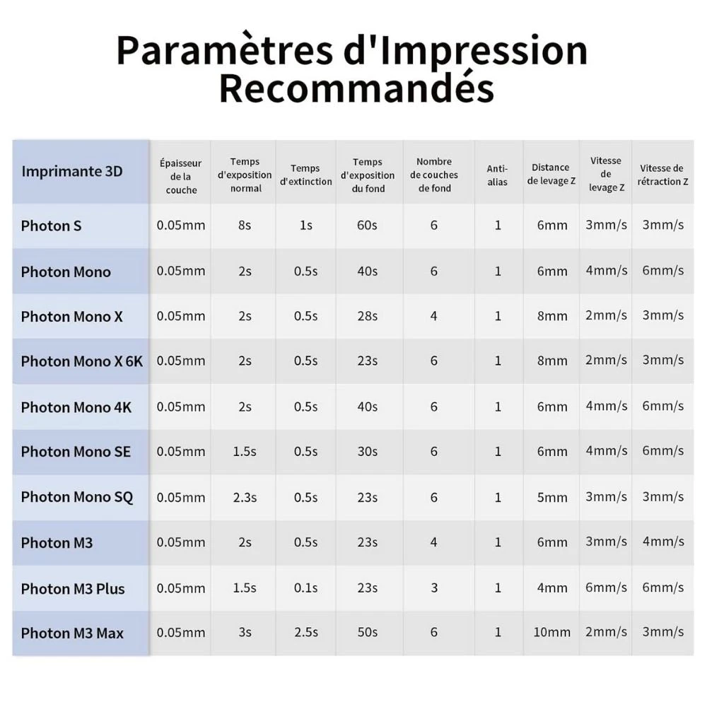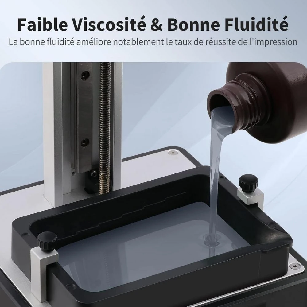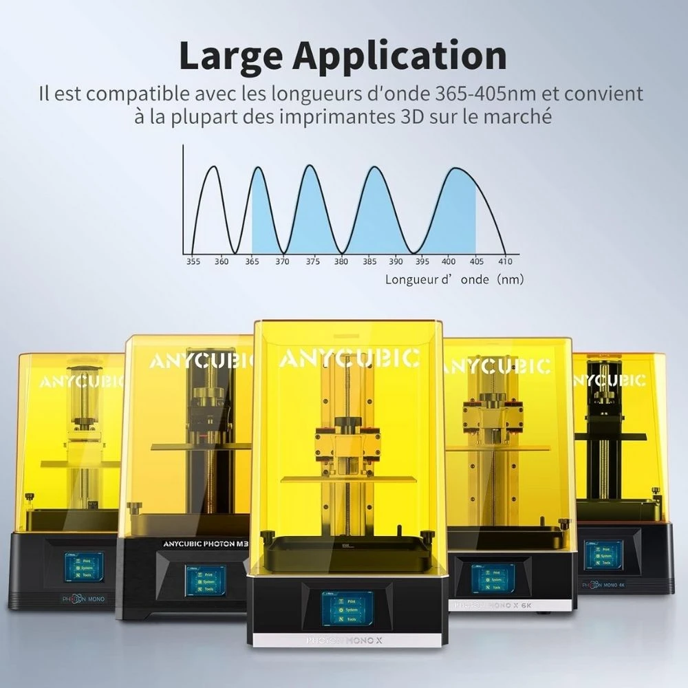 Cette résine est compatible avec une large bande de 365 à 405 nm, ce qui la rend adaptée à la plupart des imprimantes 3D à résine sur le marché. Mais si vous voulez des résultats encore meilleurs, essayez-la avec les imprimantes 3D SLA à base de LCD d’Anycubic.
