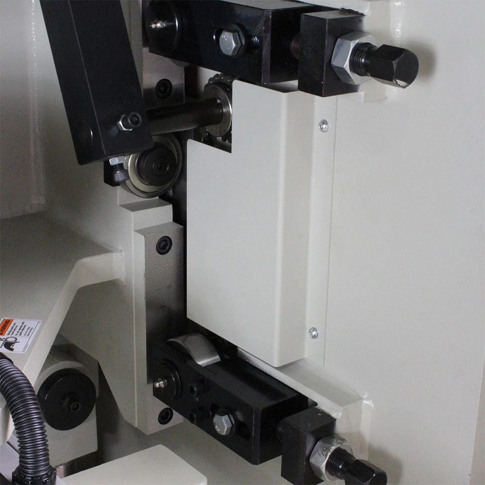 - Shearing carriage rides on hardened ways and uses heavy-duty bearings to reduce friction.