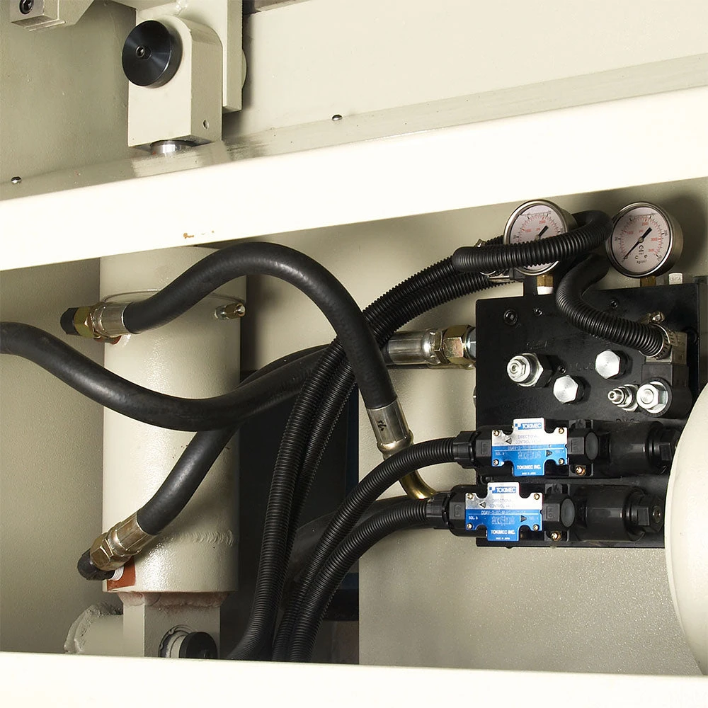 - Hydraulic hold-downs clamp the sheet solidly to the table, eliminating material lifting and improving blade life.