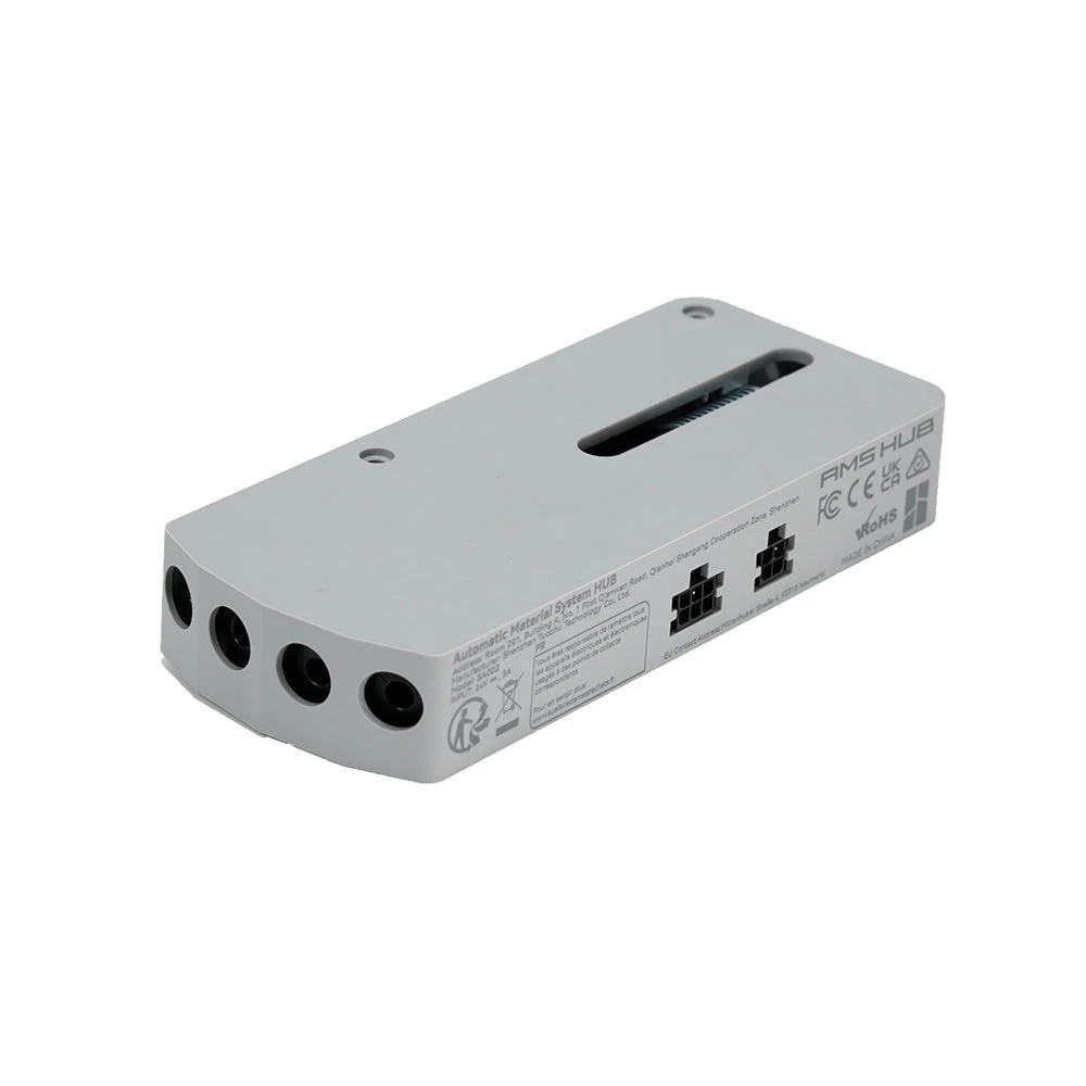 Le Hub AMS est utilisé pour augmenter le nombre d’AMS connectés aux imprimantes de la série Bambu X1 de 1 unite (4 canaux) à un maximum de 4 (16 canaux) pour améliorer la vitesse de ravitaillement sur vos multiples unités AMS et supporter la redondance d’un signal tamponné.
