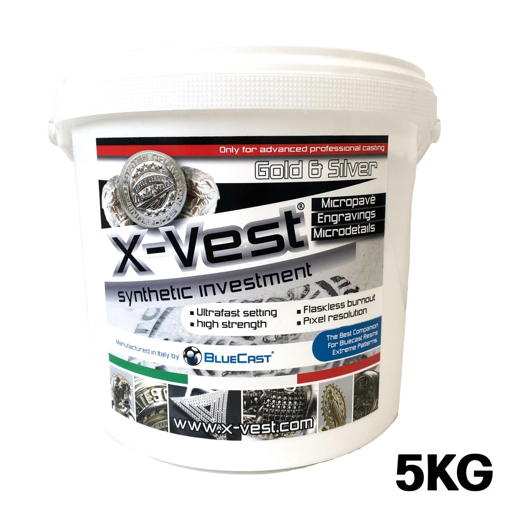 BlueCast a développé X-Vest pour répondre aux besoins des bijoutiers avancés qui demandent un revêtement de haute Performance, rapide, sûr (il est également disponible en liquide, pas de poudre à manipuler), solide mais facile à tremper, adapté à une Calcination rapide et avec l’assurance d’un « One Shot One Cast ».