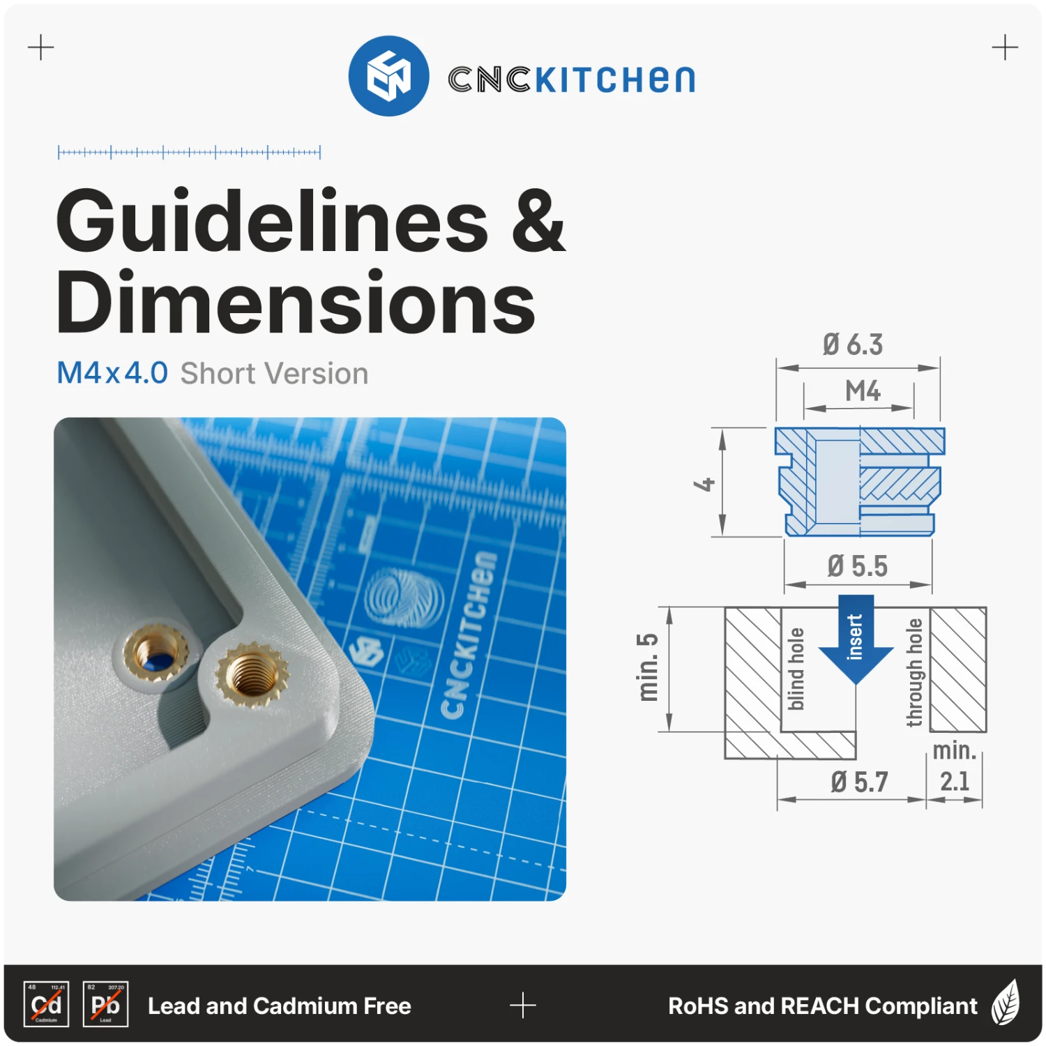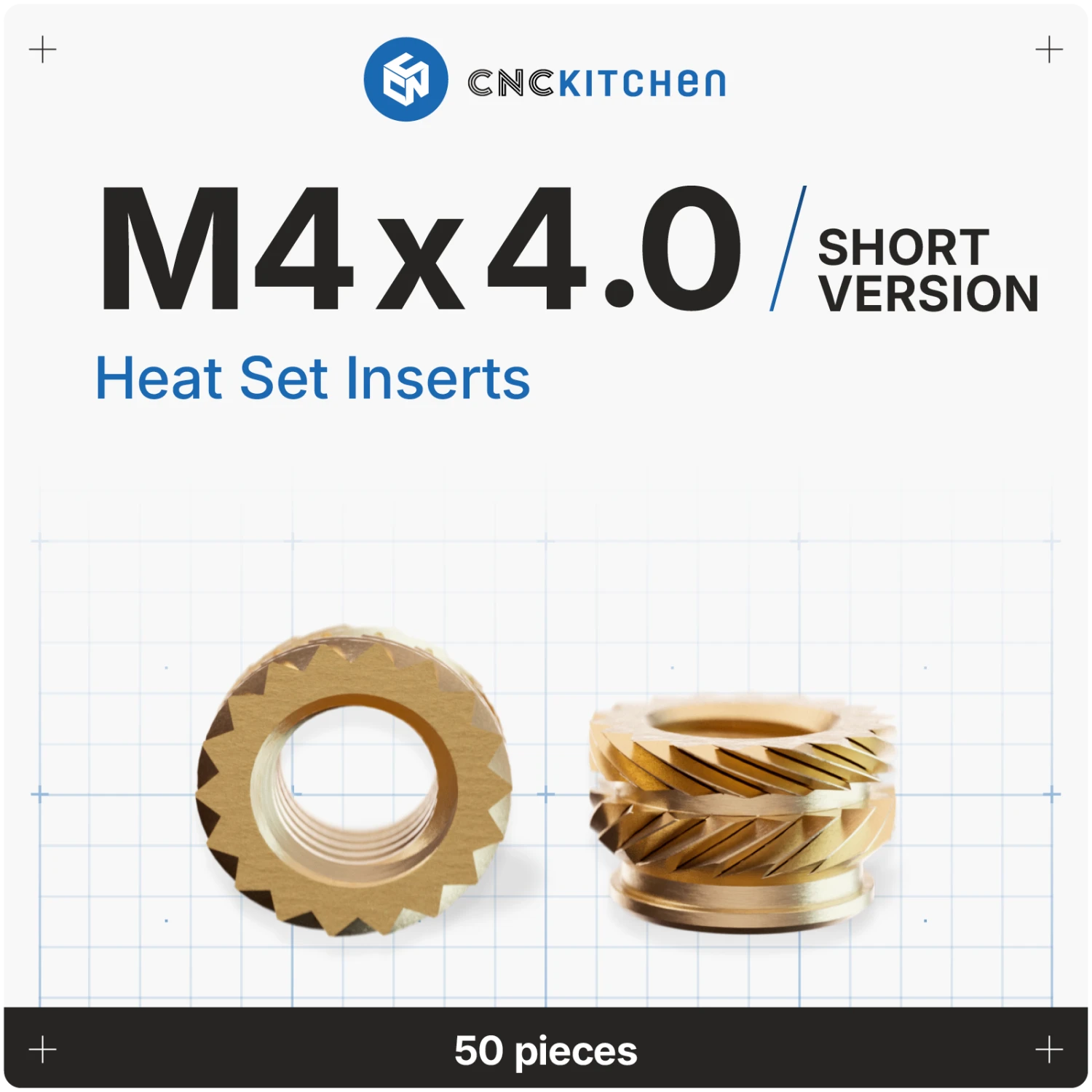 Les inserts CNC Kitchen conviennent pour tous les thermoplastiques et peuvent être utilisés pour les modèles en résine à condition d’y être collés et non enfoncés. Ils sont durables, robustes et conformes aux normes REACH et RoHS.
