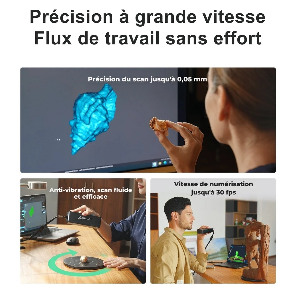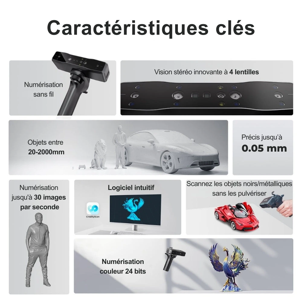 Il permet de scanner des objets allant de 20 à 2 000 mm avec une précision allant jusqu’à 0,05 mm.