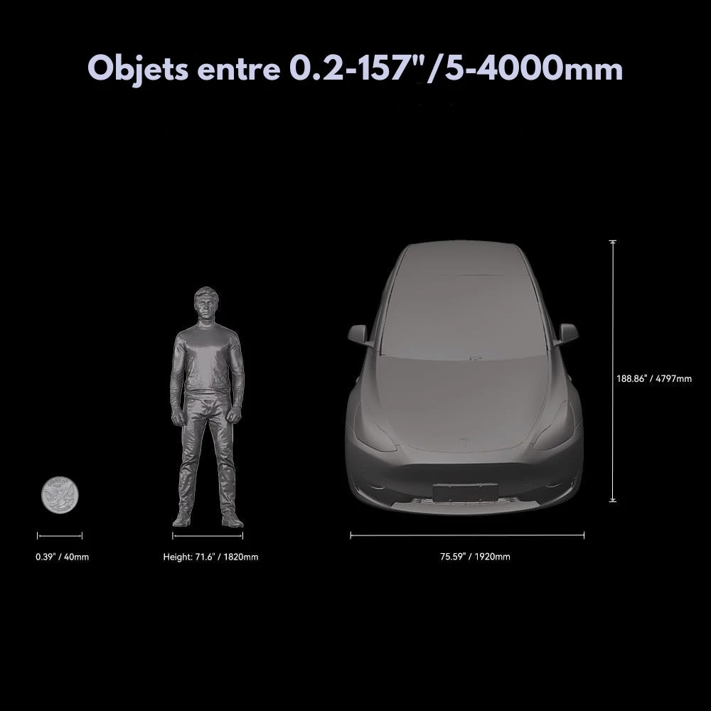Le mode visage et corps est équipé d’un algorithme unique de cartographie du visage qui capture plus de détails et scanne facilement les cheveux. Un scan du corps humain prend seulement jusqu’à 2 minutes.