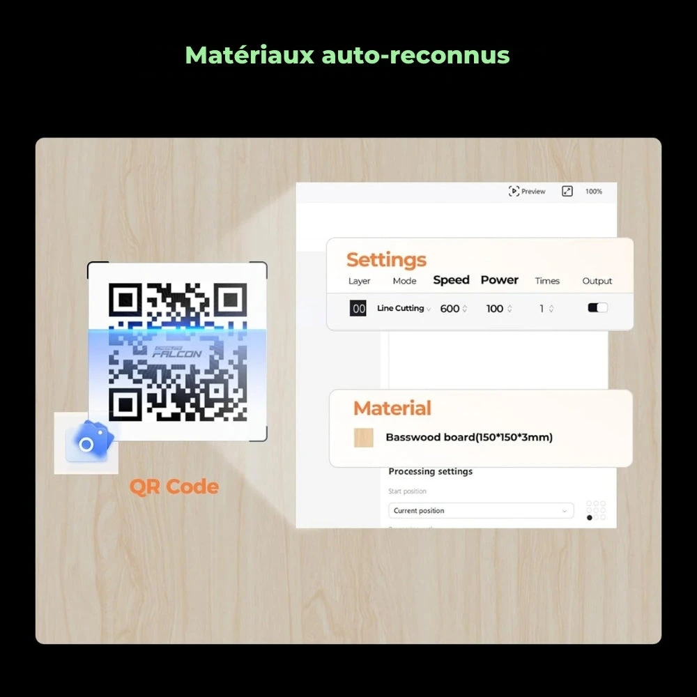 Falcon A1 détecte automatiquement les matériaux à l’aide d’un système de code QR intégré, optimisant les réglages de gravure et de découpe sans nécessiter de configuration manuelle.