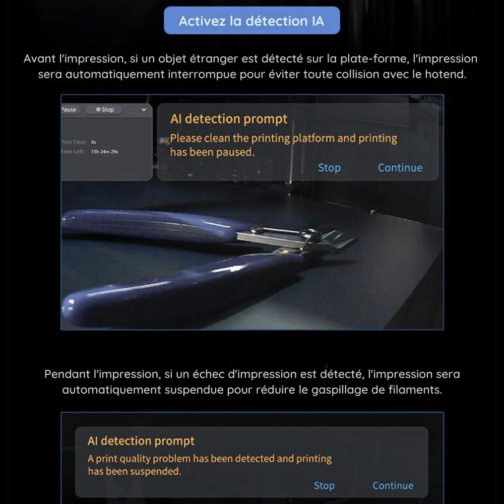 Grâce à l’intelligence artificielle intégrée, elle permet de surveiller en temps réel le processus d’impression, de créer des vidéos en accéléré, et de détecter automatiquement les défauts comme les spaghettis de filament ou les objets détachés, mettant l’impression en pause si nécessaire.