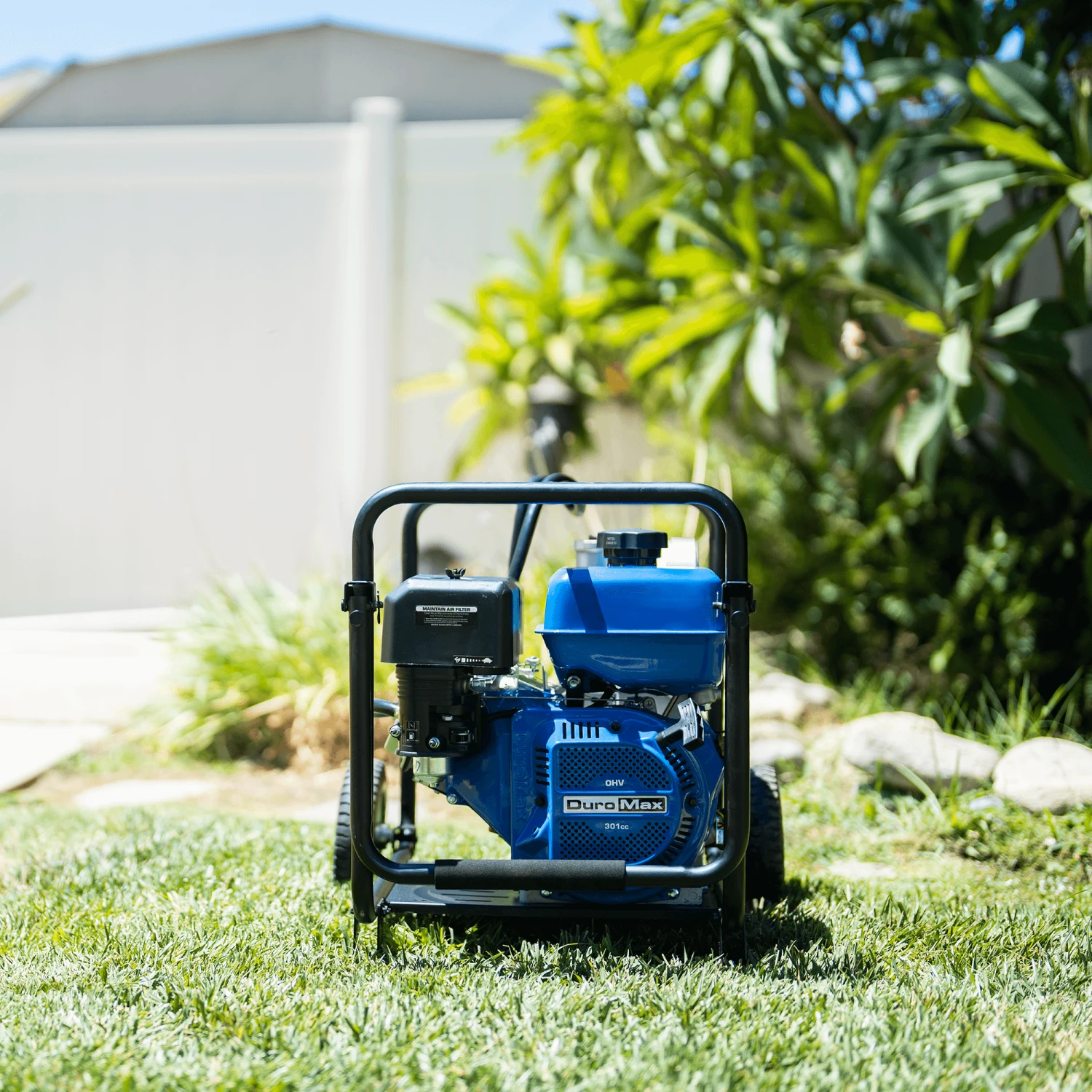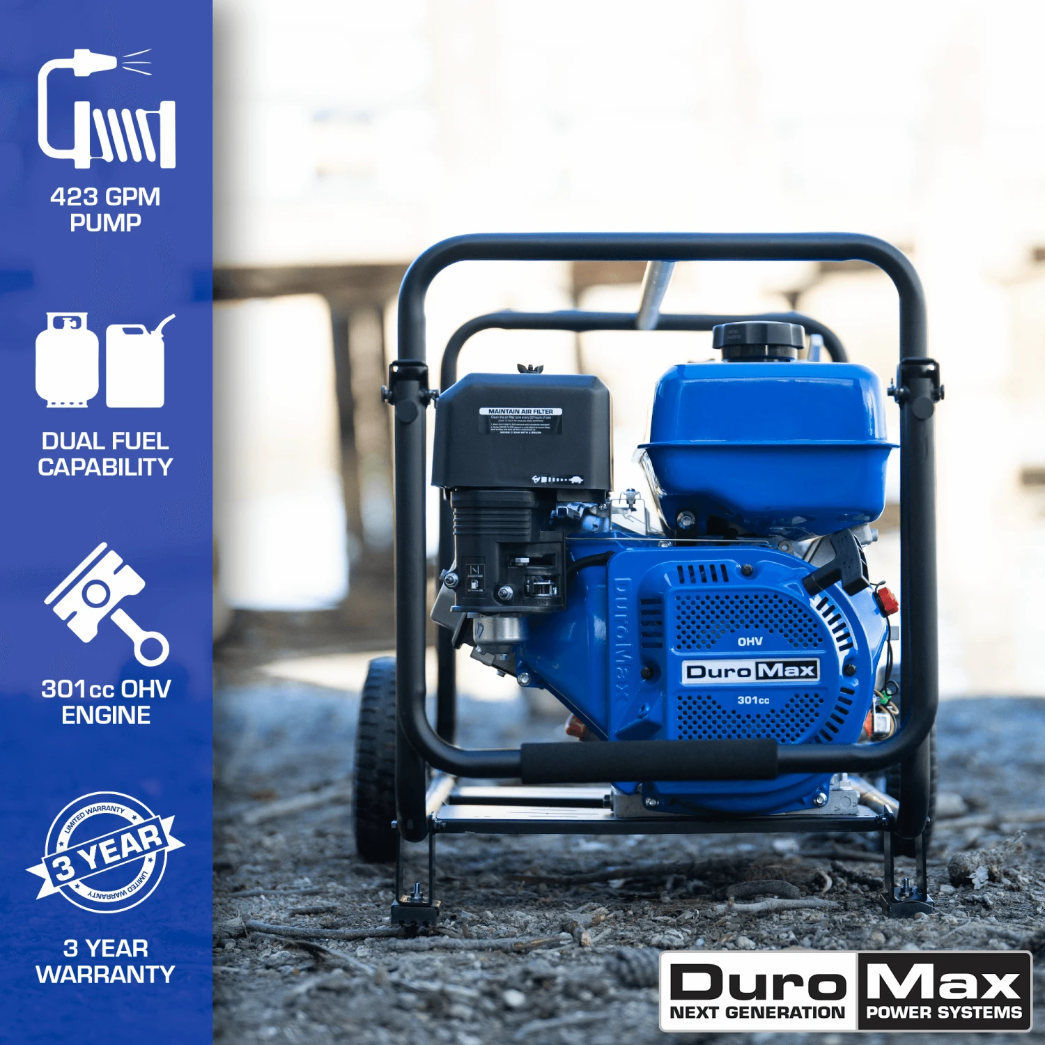 DuroMax Dual Fuel Water Pumps are the ultimate choice when choosing a semi-trash pump for quickly transferring water or de-watering flooded areas. Featuring a powerful DuroMax 301cc engine that can be fueled by either standard gas or liquid propane, this workhorse can power through a tough day’s work thanks to the freedom of fuel choice. The XP904WX can pump 423 gallons of water per minute and tackle solids or debris up to ¼” in diameter, making easy work of jobsites or farm/agricultural applications. The ability to run on propane makes this the professional’s choice, since it offers an extended runtime over the onboard gasoline tank and makes preventative maintenance easier with no gummed-up carburetors or old, stale fuel that occurs commonly with gas on less-frequently used power equipment. This water pump utilizes professional grade components such as a cast iron impeller, volute and heavy-duty seals, and is backed by a manufacturer’s 3-Year Warranty.