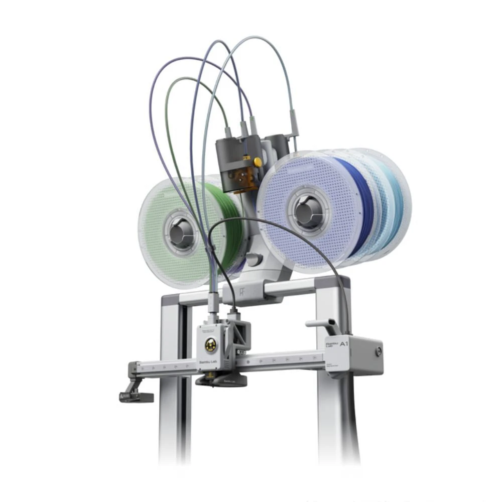 L’AMS Lite, inclus avec la Bambu Lab A1 Combo, est très fiable, il place l’impression multicolore à la portée de tous. Il s’agit d’un système de chargement automatique de filament qui permet d’utiliser jusqu’à 4 couleurs différentes pour une même tâche. Il est compatible avec davantage de types de bobines que l’AMS classique, il peut prendre en charge aussi bien les spools en carton qu’en plastique et indifféremment les spools réutilisables ou celles d’autres fabricants. L’AMS Lite est toujours équipé d’une technologie de lecture RFID qui identifie les matériaux chargés et adapte les paramètres de la machine. Il détecte aussi les quantités de filament restantes et est donc capable de switcher d’une bobine à une autre en fonction des besoins afin que votre print s’achève au mieux.