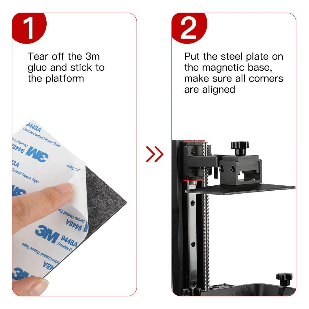 - La base magnétique offre un magnétisme puissant, assure un ajustement parfait avec la plaque d’acier. L’adhésif 3M a forte viscosité et une bonne adhésion à basse température, maintient fermement la plaque en place sur le plateau d’impression.