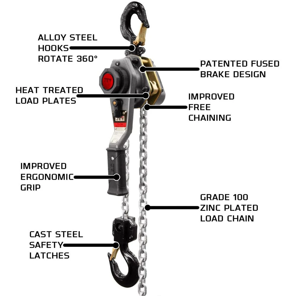 - Patented handle design allows for extra clearance between the operator’s hand and load chain