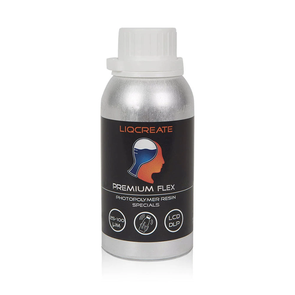 Les pièces imprimées en 3D à partir de ce matériau présentent une stabilité dimensionnelle exceptionnelle et un faible retrait lors de l’impression. Liqcreate Premium Flex peut durcir très rapidement, elle est facile à utiliser sur toutes les imprimantes 3D LCD et DLP open source dans la gamme de 385 à 420 nm. Son allongement élevé et sa faible dureté Shore A63 le rend parfait pour une grande variété de prototypes « soft touch » et élastiques.