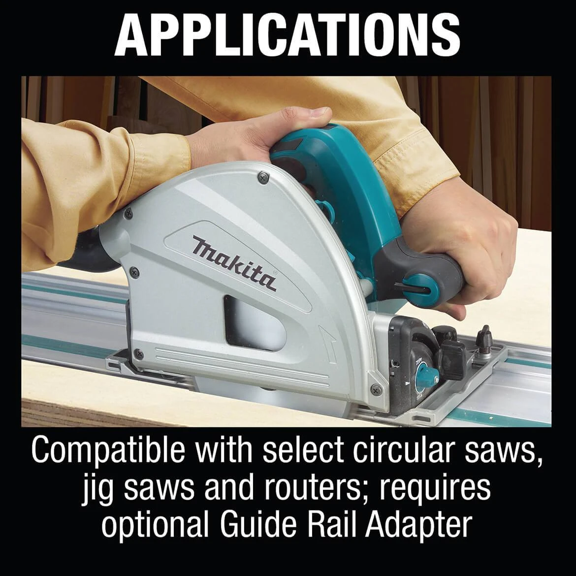- Compatible with select Makita circular saws, jig saws and routers when used in conjunction with required Guide Rail Adapter