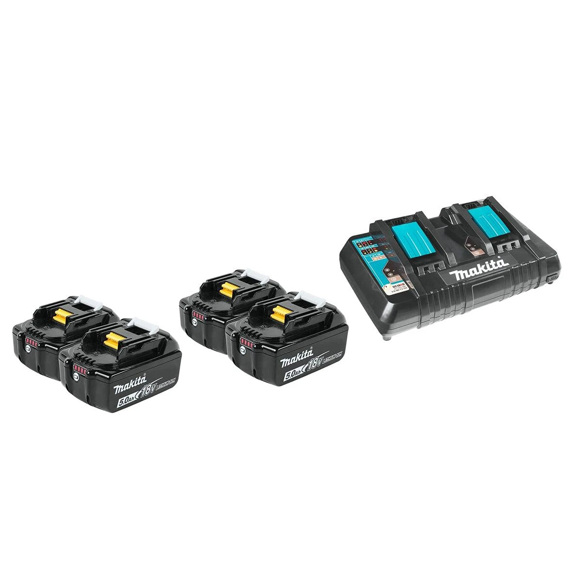 - Dual Port Charger charges two (2) 18V LXT Lithium-Ion 5.0Ah batteries in only 45 minutes