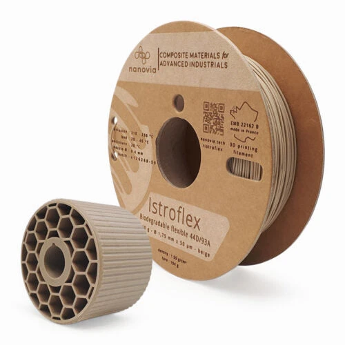 ISTROFLEX® est un filament thermoplastique flexible pour les imprimantes 3D technologie FDM. Ce matériau spécialement formulé est flexible avec des propriétés de faible élasticité. Ce polymère à base de poudre de coquilles d’huîtres est un matériau entièrement biodégradable par compostage. ISTROFLEX® est une formulation exclusive incluant un polymère de poids moléculaire élevé à base de monomères biodégradables et des coquilles d’huîtres grade cosmétique. ISTROFLEX® est actuellement en cours de tests en vue d’obtenir la certification européenne NF EN 14995 (matériau biodégradable par compostage dans un environnement industriel). La matrice d’ISTROFLEX® est dégradée par les micro-organismes naturellement présents dans les sols naturels et les composts.
