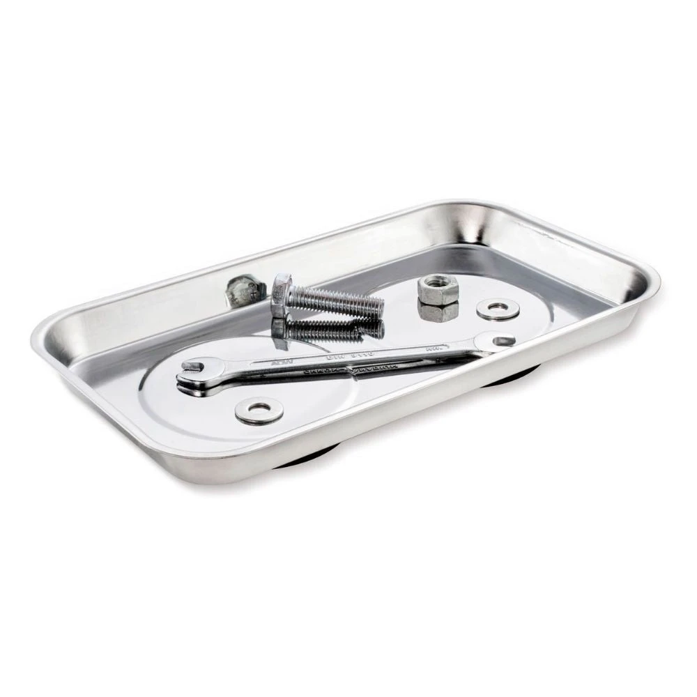 Un plateau en acier inoxydable aimanté des deux cotés pour déposer vos outils et visseries métalliques en toute sécurité et les garder à portée de main. Le socle est en plastique pour préserver vos surfaces de travail.