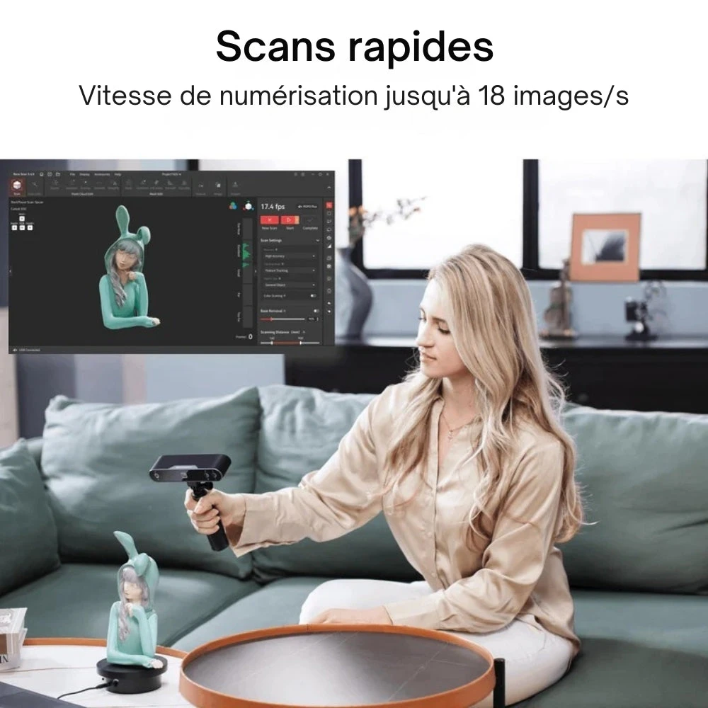 Le Revopoint POP 3 Plus est un scanner 3D compact et performant, idéal pour les professionnels et les passionnés de modélisation 3D. Par rapport à son prédécesseur, il offre une précision améliorée de 20% et peut capturer les détails les plus fins avec une résolution de 0,08 mm et une vitesse de 18 images par seconde.