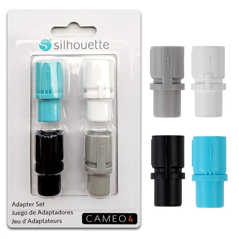 Le jeu d’adaptateurs pour outils Cameo 4 contient 4 adaptateurs qui vous permettent d’utiliser les outils Silhouette des modèles de machine précédents et certains outils spécifiques avec la Silhouette Cameo® 4 et la portrait 3.