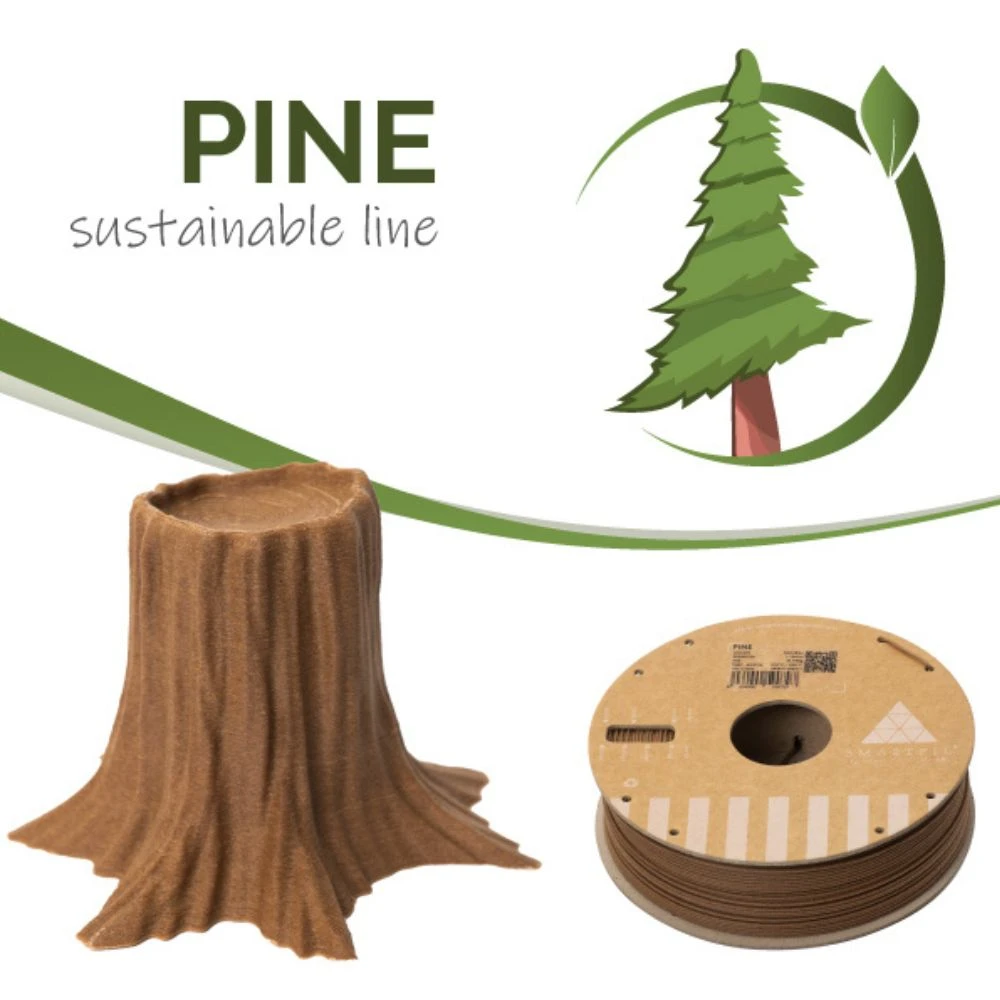 Le SmartFil Pine est un filament de la gamme Durable de Smart Materials 3D. De haute qualité, biodégradable et compostable, il est fabriqué avec une base de polymère et du bois de pin broyé. La réutilisation de ces déchets organiques issus de chutes de l’industrie du bois favorise l’économie circulaire et contribue à protéger l’environnement. Il dégage de plus une délicieuse odeur de pin lors de l’impression.