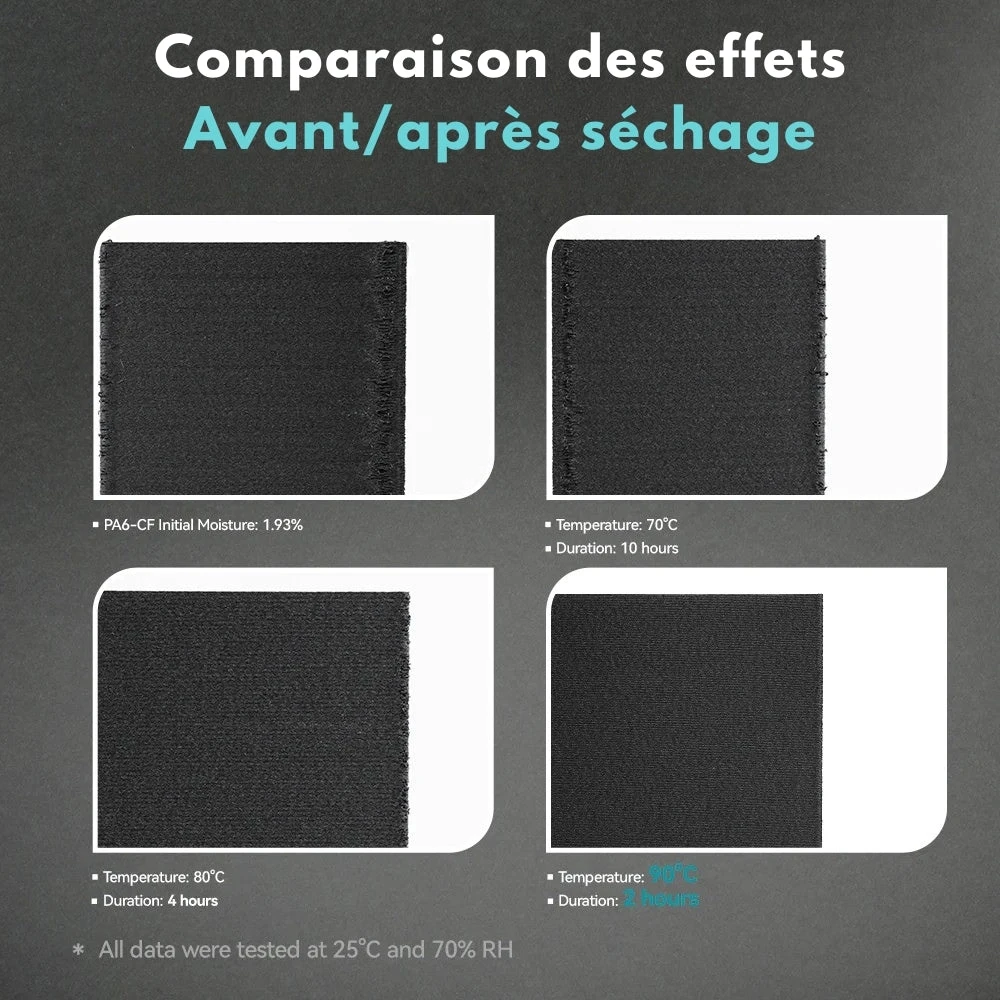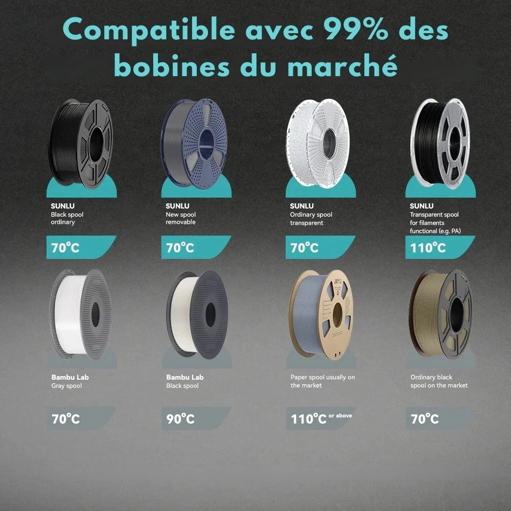 Il est compatible avec la grande majorité des bobines et des matériaux (ABS, PC, PA, etc.), même les plus sensibles à l’humidité.