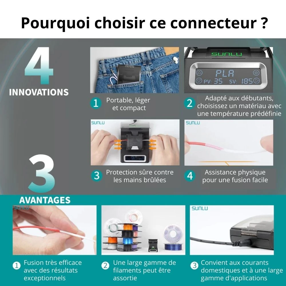 Le connecteur de filament Sunlu FC01 est très facile à utiliser grâce à son interface simple et intuitive. Il suffit de choisir les bons réglages en fonction du type de filament et de suivre les instructions détaillées ou les vidéos tutorielles. Pas besoin d’être un expert, c’est parfait pour les débutants. En plus, la fusion se fait en 10 à 15 secondes seulement !