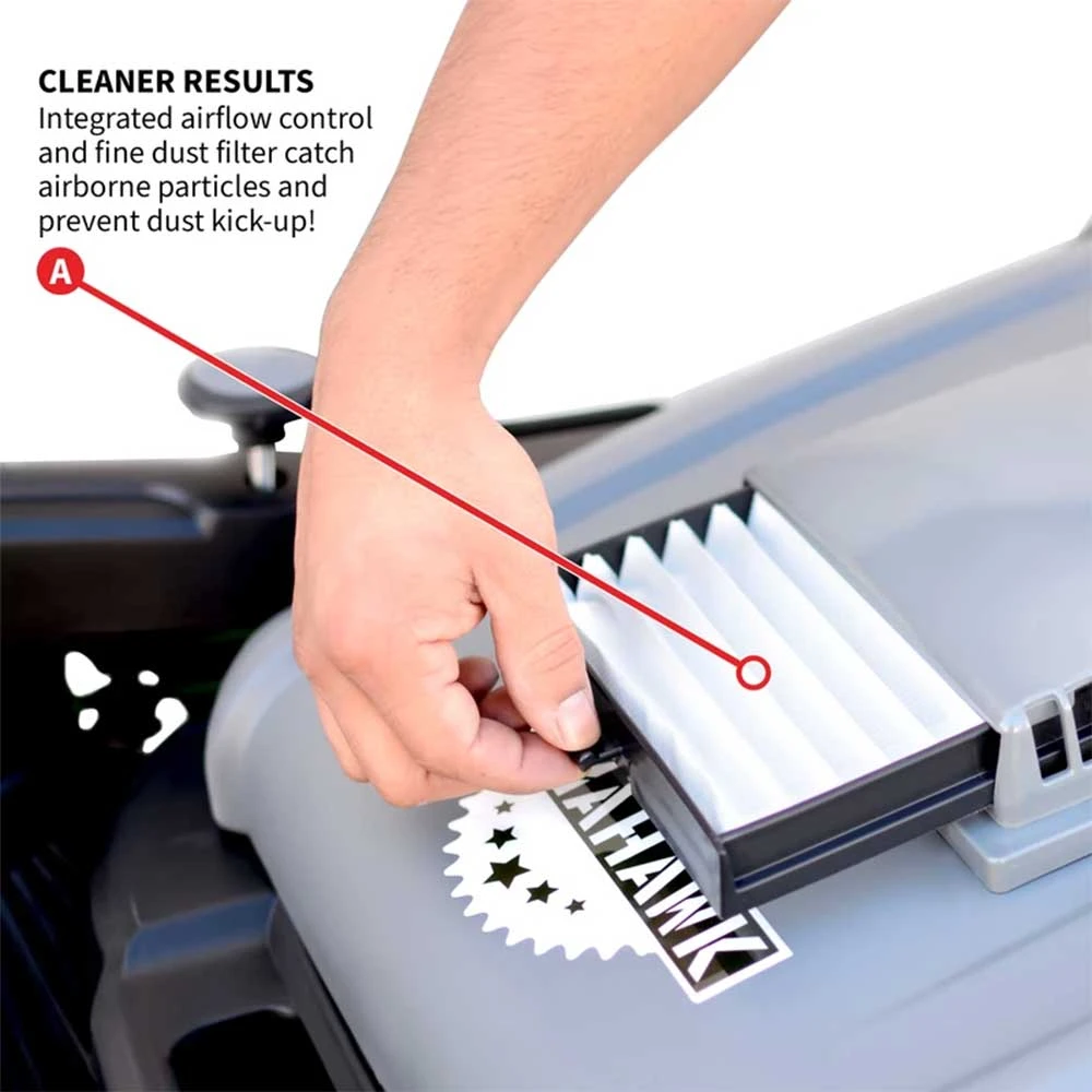 fully to store it out of sight until your next use! - Includes integrated airflow control and fine dust filter to catch airborne particles and prevent dust kick-up