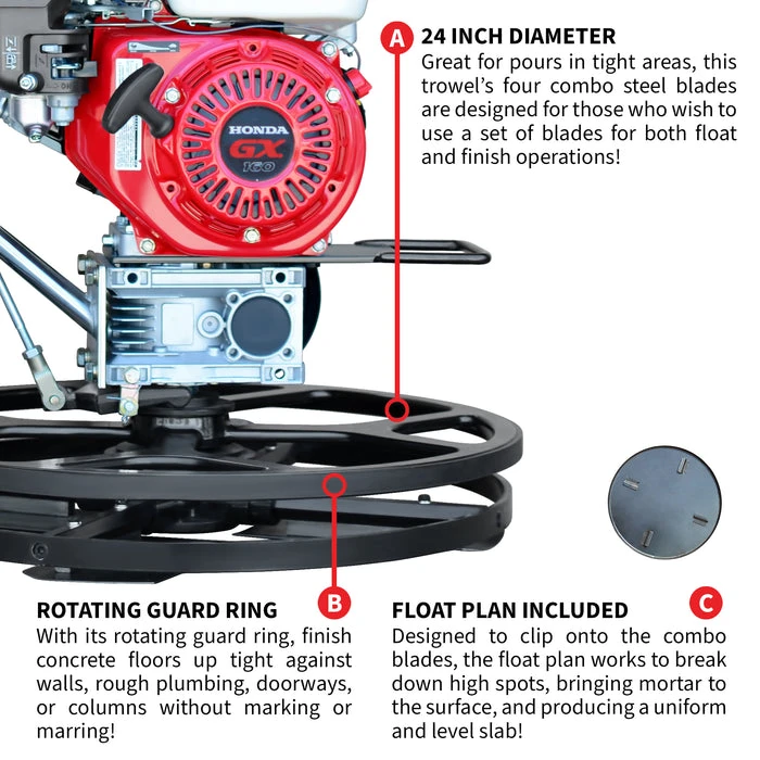 - [HONDA GX160 ENGINE] Equipped with a high-performance Honda engine, delivering reliable and efficient power for smooth concrete finishing.