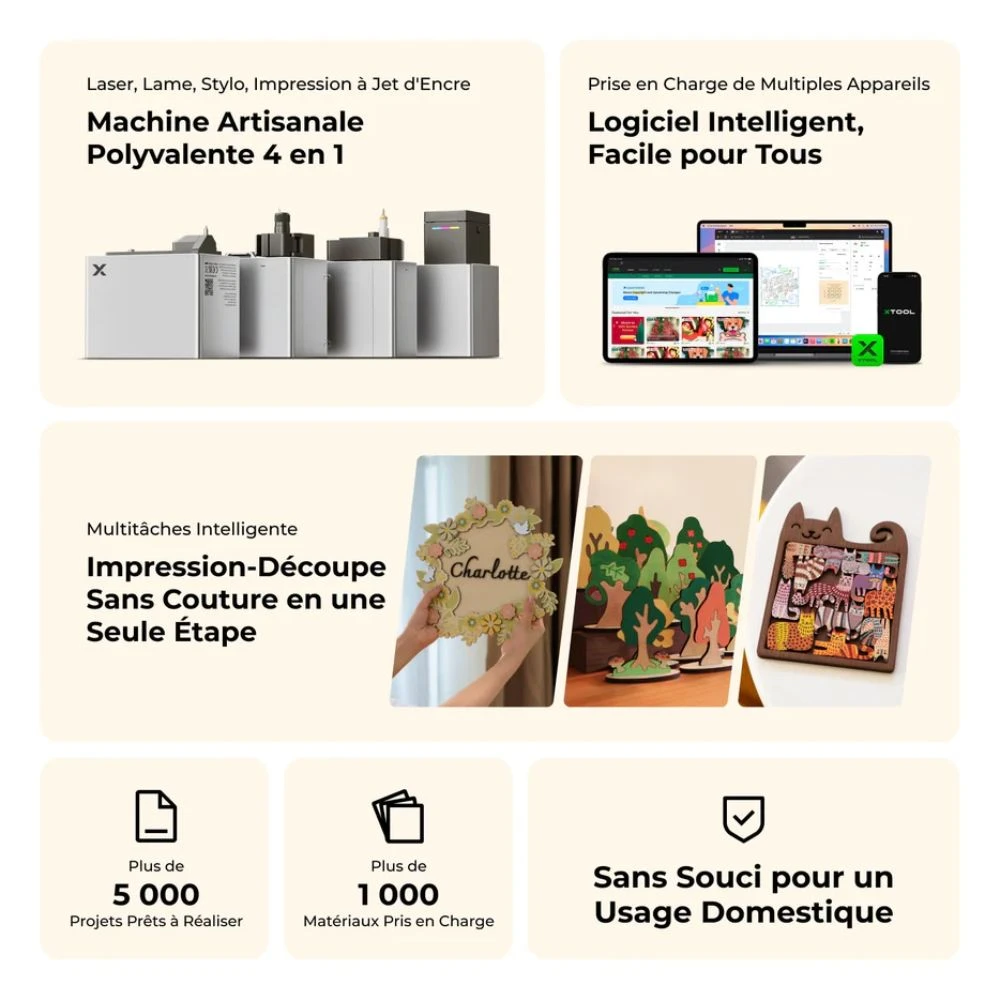 Le xTool M1 Ultra est une machine polyvalente 4-en-1, combinant un laser, une lame de découpe, une imprimante jet d’encre et un traceur de dessin, idéale pour répondre à tous vos besoins créatifs.