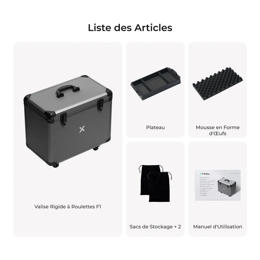 Sa structure rigide garantit une protection contre les chocs et les impacts, tandis que son intérieur spacieux et bien organisé assure que votre xTool F1 et ses accessoires restent en place. Idéale pour les professionnels en déplacement, cette valise combine durabilité, praticité et style, faisant d’elle un choix incontournable pour ceux qui cherchent à transporter leur matériel sans compromis sur la sécurité.