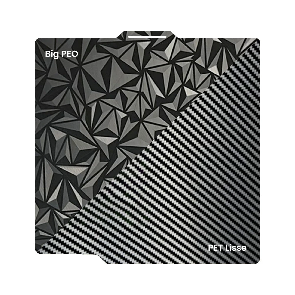 Une large diversité de filaments peut être imprimée sur ce plateau. Nous recommandons d’utiliser le PET pour le PLA, le PETG et le TPU et de préférer le PEO pour l’ABS.